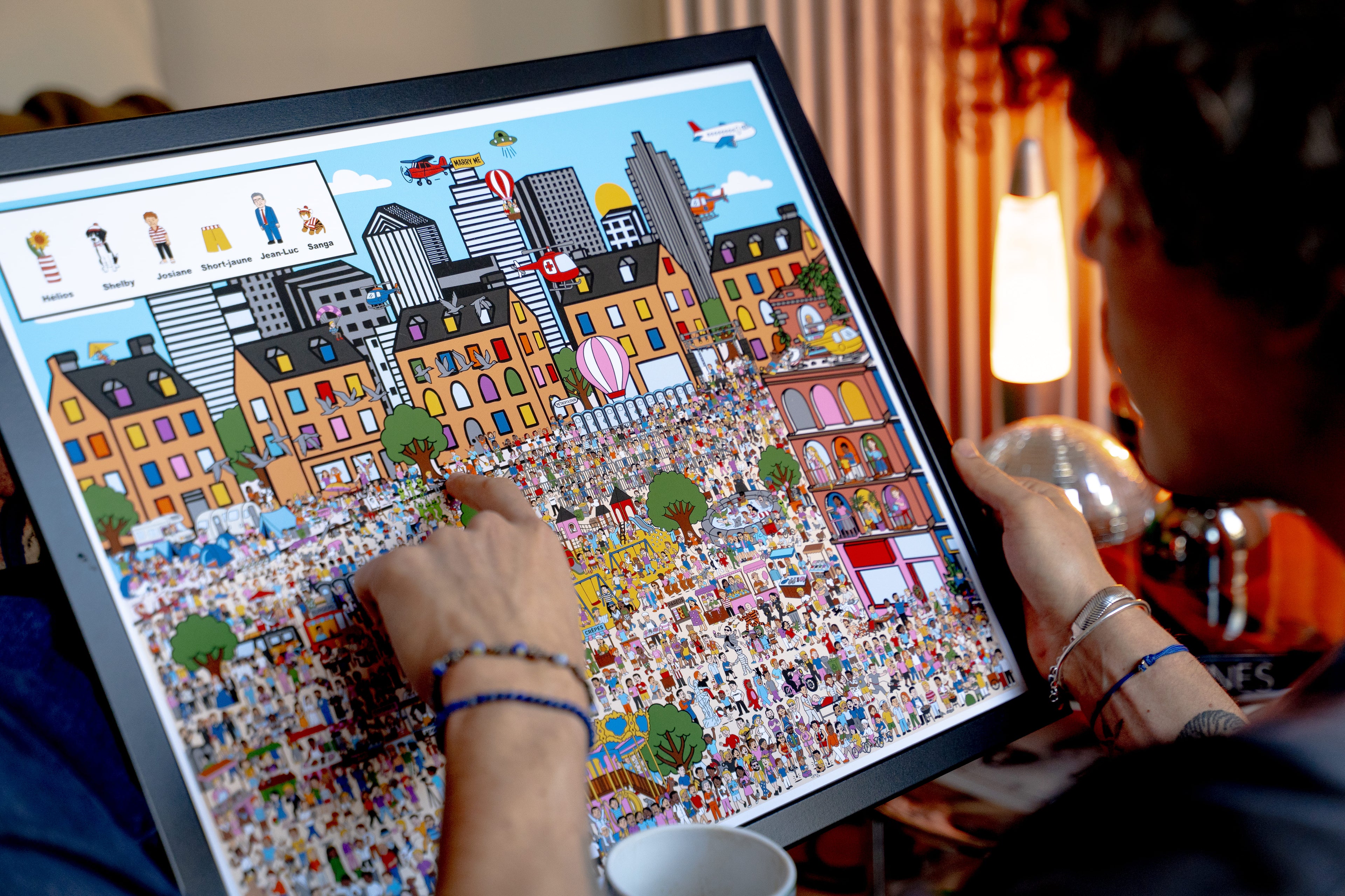 Nous partons de votre photo et nous cachons la personne (ou l’animal) dans une illustration pleine de détails, de mini-scènes et de clins d’œil personnalisés.Chaque décor contient des centaines d’éléments dessinés à la main, pour créer un univers vivant et unique.